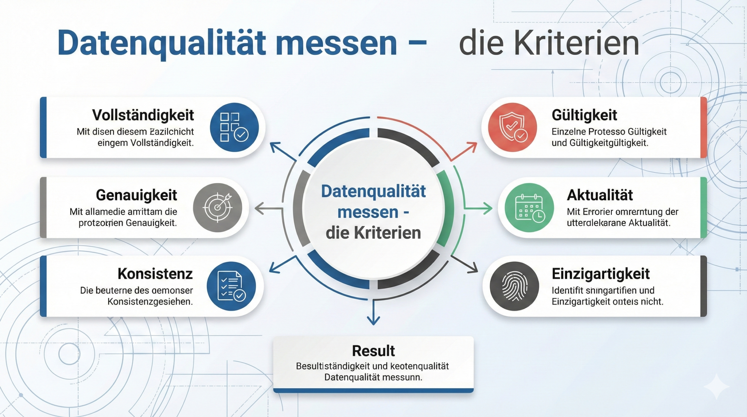 Wir messen und bewerten die Datenqualität mit allgemein gültigen Kriterien. Diese Kriterien sind nicht unbedingt selbsterklärend, sollten aber herangezogen werden, um den Aufwand und Nutzen von Maßnahmen zur Verbesserung Datenqualität einzuschätzen.